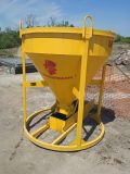 Это сварной неповоротный конус, собранный из листовой стали. Прочность и долговечность бункера зависит не только от качества металла, но и от надежности швов. Наклонить или повернуть колокольчик нельзя — никаких механизмов для этого не предусмотрено. Имеет простейшую конструкцию: сварной конус по верхнему краю окантован для жесткости швеллером, имеет 4 стойки (тоже швеллеры) и 4 проушины для строп. Снизу для выгрузки содержимого бункера предусмотрен челюстной затвор — простой и эффективный. А если понадобится заливать бетон в труднодоступные места, бункер оснащается лотком и рядом располагается рабочий в строительной люльке — он вовремя открывает затвор и бетон льется точно куда надо.