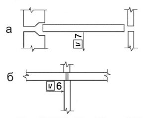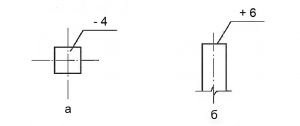 Рисунок 4. Примеры указания фактических отклонений поверхностей элементов от вертикальности: а) на плане; б) на разрезе - 4.9.3. Фактические отклонения от проектных отметок показываются числовым значением в см для грунтовых и других поверхностей рельефа, в мм для других элементов со знаком «плюс» в случае превышения или «минус» в случае занижения. Направляющую линию соединяют с точкой поверхности, к которой относится отклонение (см. рисунок 1).