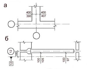 Рисунок 1. Примеры указания действительных отклонений поверхностей: а) сваи или колонны на плане; б) колонны на разрезе